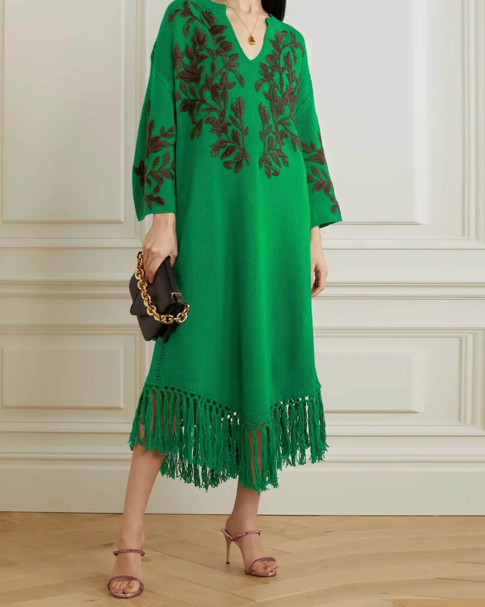 Fringed embroidered wool midi dress