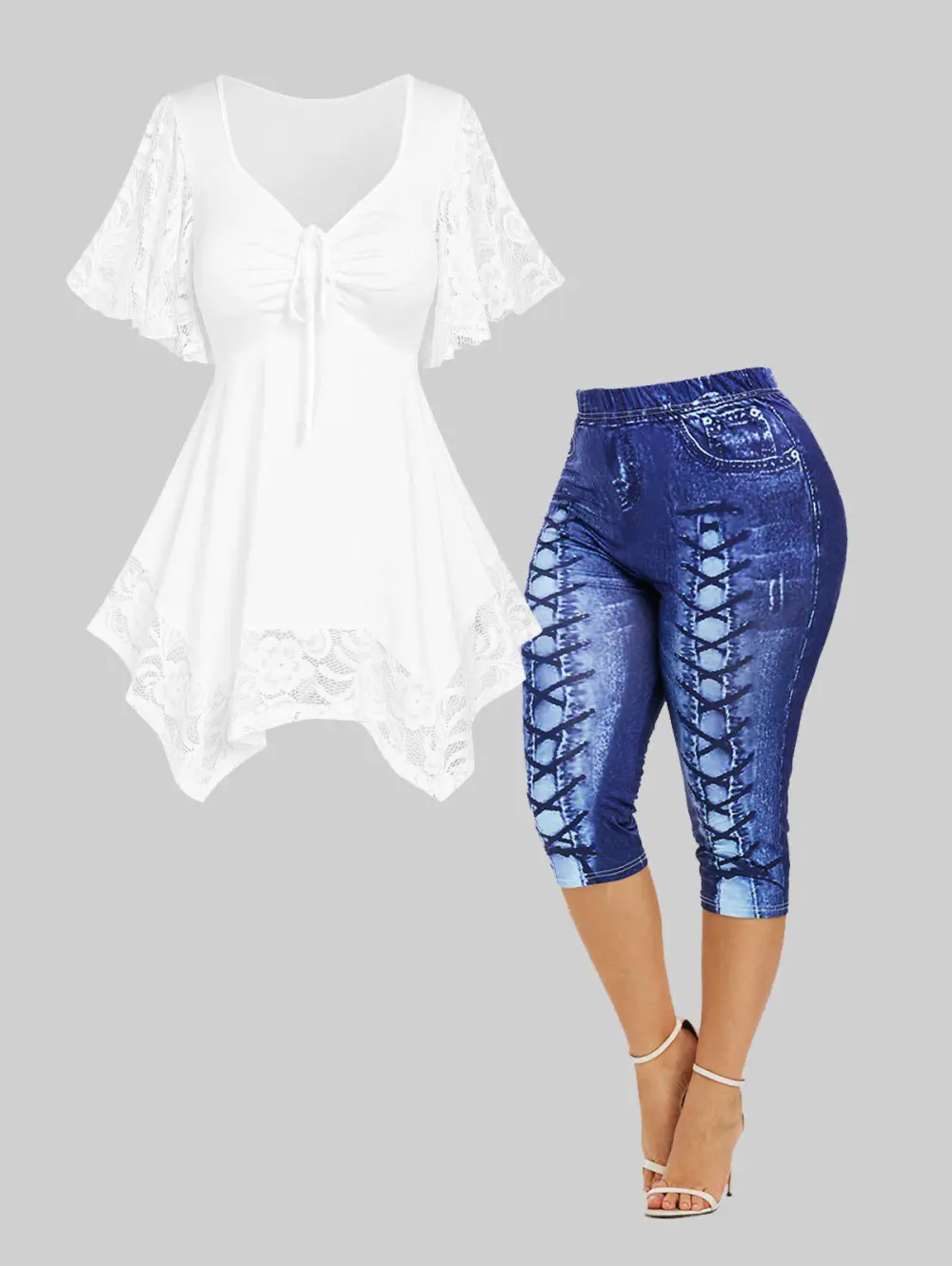 Lace Insert Flutter Sleeve T Shirt and 3D Lace Up Jean Print Capri Leggings Plus Size Summer Outfit