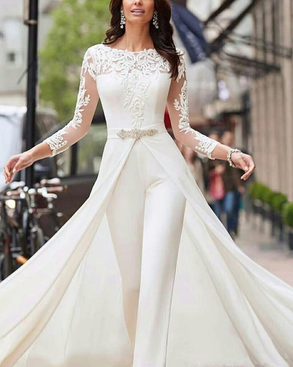 White Jumpsuits Pants Long Sleeve Wedding Dresses Lace Satin With Overskirts 748054