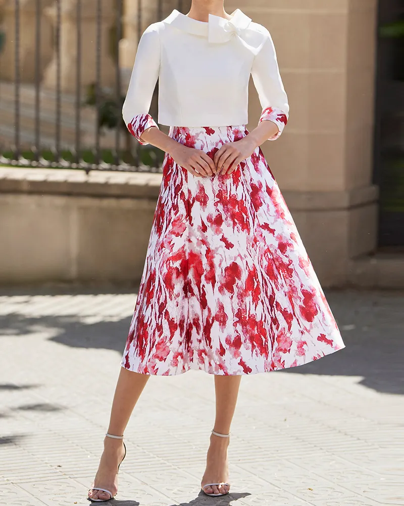 Women's Elegant Printed Bow Brocade Midi Dress 746099