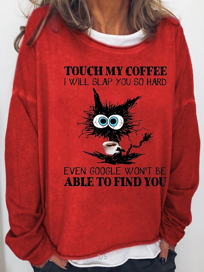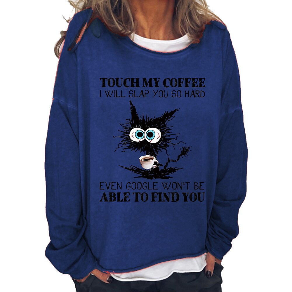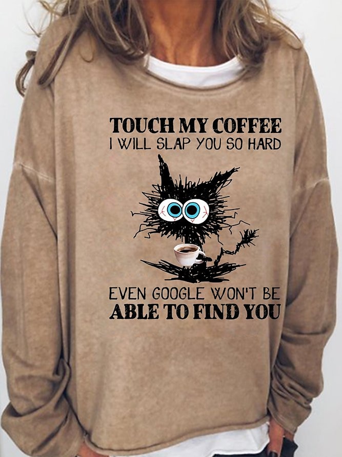 Gender:Women's,Style:Streetwear,Vintage,Active,Occasion:Sports,Daily,Sports Clothing Sub Category:Pullover,Sweatshirt,Neckline:Round Neck,Fabric:Cotton Blend,Design:Print,Sleeve Length:Long Sleeve,Elasticity:Micro-elastic,Look After Me:Wet and Dry Cleaning,Washable,Machine wash,Top Length:Regular,Pattern:Cat,Season:Fall & Winter,Details:Without Lining,Fit Type:Loose Fit,Text Word:touch my coffee i will slap you so hard even google won't be able to find you,