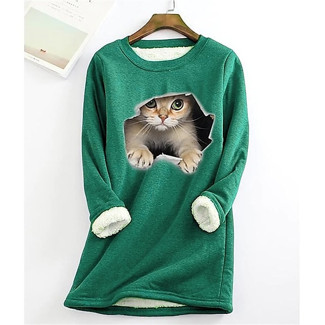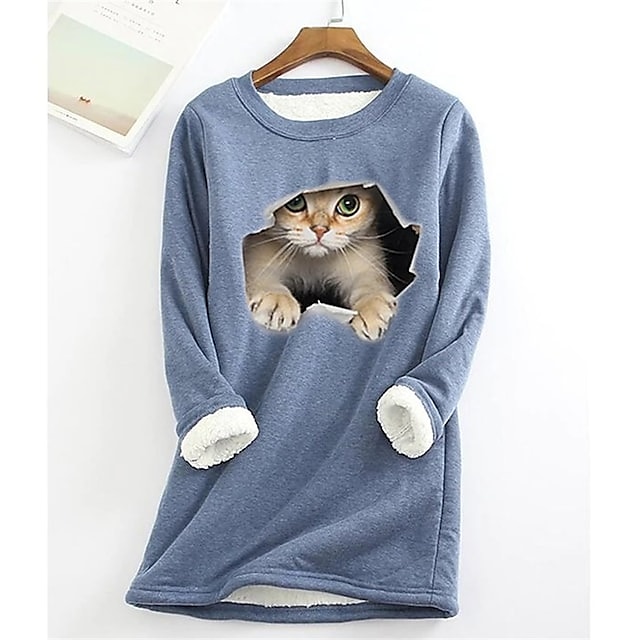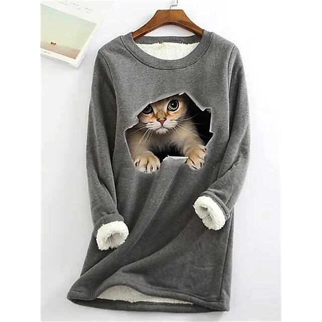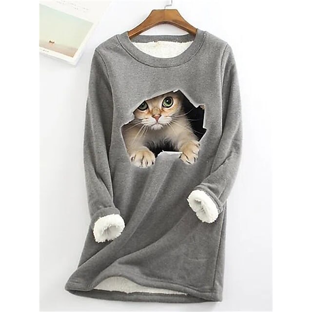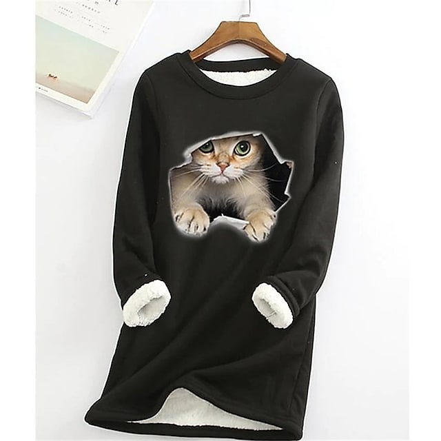 Gender:Women's,Style:Athleisure,Streetwear,Casual / Sporty,Active,Sportswear,Occasion:Weekend,Leisure Sports,Sports Clothing Sub Category:Pullover,Sweatshirt,Neckline:Round Neck,Fabric:Fleece,Sleeve Length:Long Sleeve,Elasticity:Micro-elastic,Look After Me:Washable,Top Length:Regular,Pattern:Cat,Season:Fall & Winter,Autumn / Fall,Details:Fleece lined,Fit Type:Regular Fit,