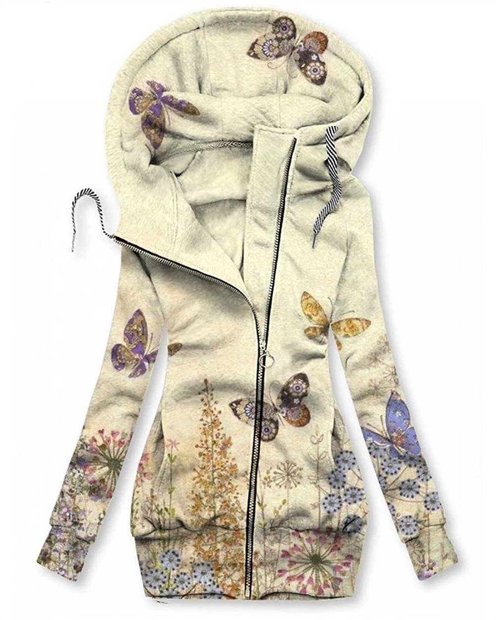 Gender:Women's,Style:Basic,Occasion:Casual,Street,Sports Clothing Sub Category:Zip Hoodie Sweatshirt,Neckline:Hoodie,Design:Front Pocket,Zip Up,Sleeve Length:Long Sleeve,Elasticity:Micro-elastic,Look After Me:Machine wash,Washable,Wet and Dry,Top Length:Regular,Pattern:Butterfly,Floral,Season:Fall & Winter,Details:Top,Fit Type:Regular Fit,